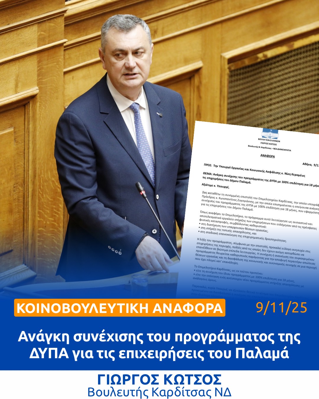 Αναφορά κατέθεσε ο Βουλευτής της Νέας Δημοκρατίας του Νομού Καρδίτσας κ. Γιώργος Κωτσός στην Υπουργό Εργασίας και Κοινωνικής Ασφάλισης, Νίκη Κεραμέως.