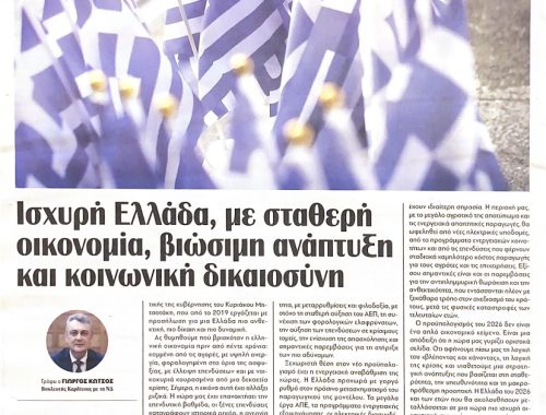 Γιώργος Κωτσός στο «Μανιφέστο»: Ισχυρή Ελλάδα, με σταθερή οικονομία, βιώσιμη ανάπτυξη και κοινωνική δικαιοσύνη. Ο προϋπολογισμός του 2026 κατατίθεται στη Βουλή σε μια περίοδο όπου η Ελλάδα συνεχίζει με σταθερά βήματα την πορεία της προς την οικονομική ανόρθωση, την κοινωνική σταθερότητα και…