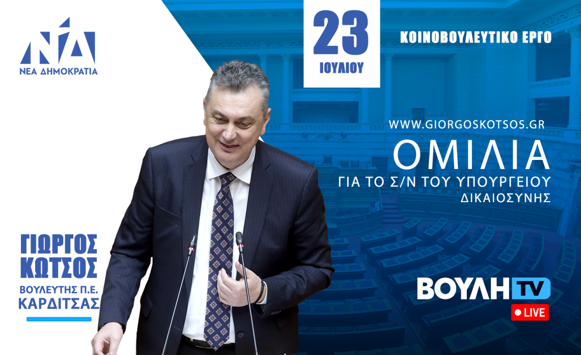 Δείτε την ομιλία του Βουλευτή ΝΔ ν. Καρδίτσας Γιώργου Κωτσού στη Βουλή των Ελλήνων για το σ/ν του Υπουργείου Δικαιοσύνης: «Παρεμβάσεις στον Κώδικα Πολιτικής Δικονομίας - Τροποποιήσεις σχετικά με τη δημοσίευση διαθηκών - Τροποποιήσεις στο ρυθμιστικό πλαίσιο των ανακοπών κατά της αναγκαστικής εκτέλεσης με σκοπό την επιτάχυνση της εκδίκασης - Λοιπές διατάξεις αρμοδιότητας του Υπουργείου Δικαιοσύνης».