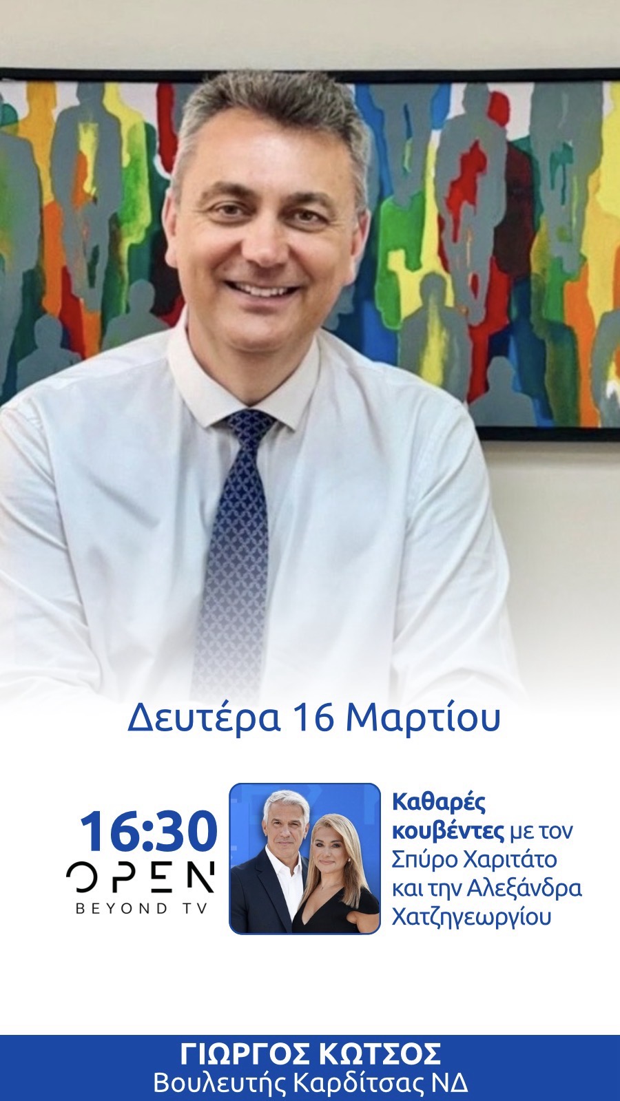 Ο Βουλευτής Καρδίτσας, Γιώργος Κωτσός, παραχώρησε συνέντευξη στον τηλεοπτικό σταθμό Open και στην εκπομπή «Καθαρές κουβέντες» με τους δημοσιογράφους Σπύρο Χαριτάτο και Αλεξάνδρα Χατζηγεωργίου.