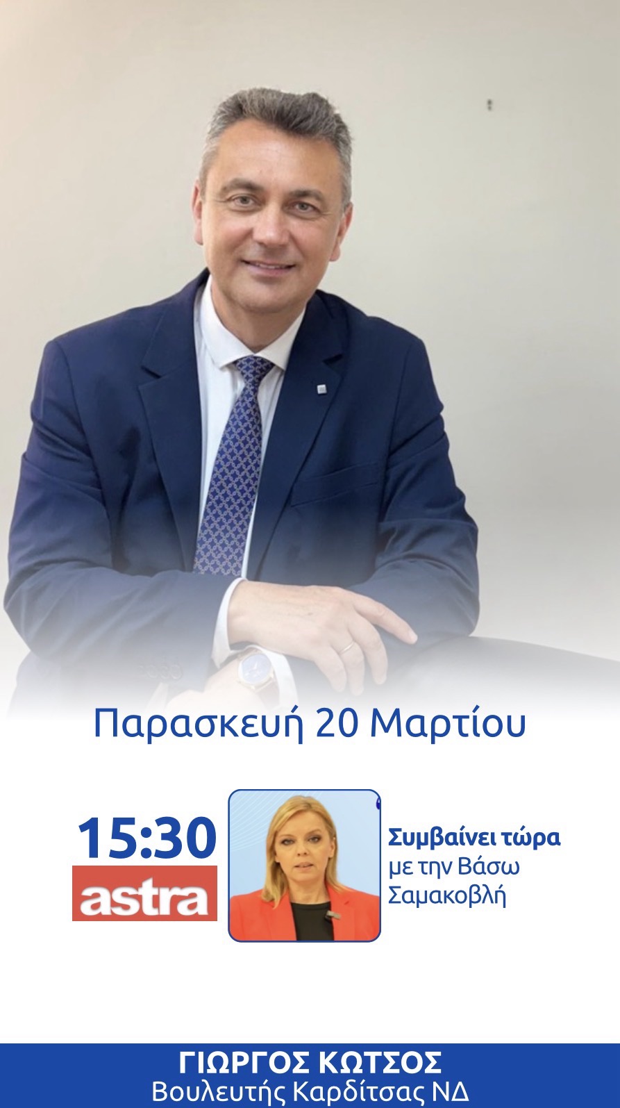 Gallery YouTube, Γραφείο Τύπου, Ενημέρωση, Συνεντεύξεις Στην εκπομπή ΄΄Συμβαίνει τώρα΄΄ του Astra 20/3/26 20 Μαρτίου 2026 O Βουλευτής Καρδίτσας, Γιώργος Κωτσός, παραχώρησε συνέντευξη στον τηλεοπτικό σταθμό Astra και στην εκπομπή "Συμβαίνει τώρα" με την δημοσιογράφο Βάσω Σαμακοβλή. Προηγούμενο Κοινοβουλευτική αναφορά προς την Υπουργό Εργασίας, Νίκη Κεραμέως 19/3/26 νεότερα Στα εγκαίνια του Κέντρου Έρευνας και Καινοτομίας Ορεινότητας στη λίμνη Πλαστήρα 21/3/26