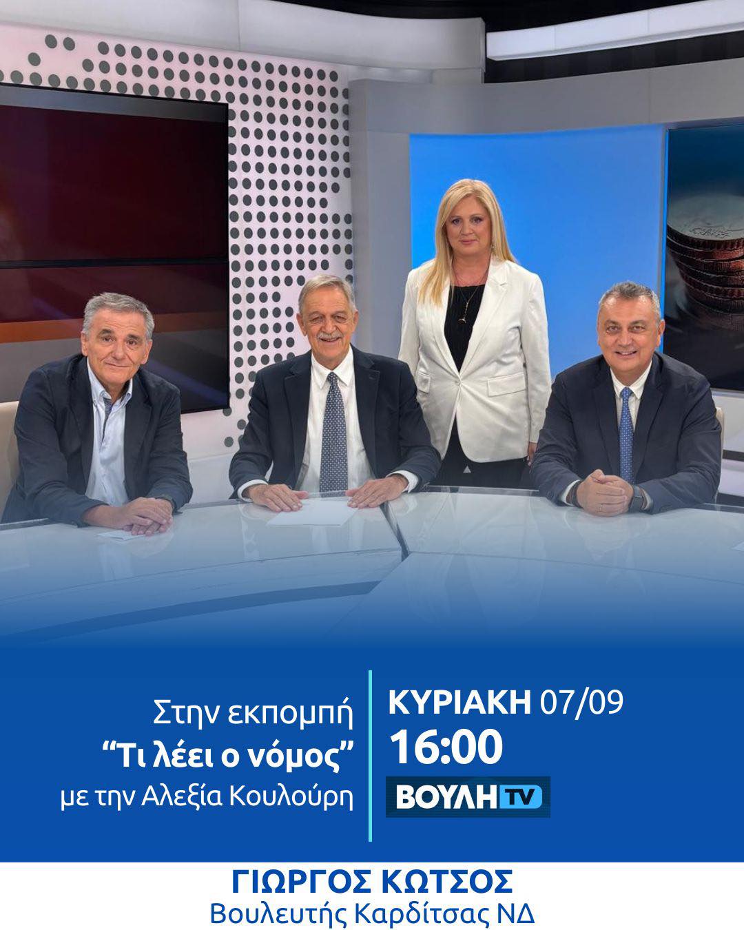 Gallery YouTube, Ενημέρωση, Κωτσός Γιώργος, Συνεντεύξεις Στο κανάλι της Βουλής 7/9/25 7 Σεπτεμβρίου 2025 Δείτε την συνέντευξη του Βουλευτή ΝΔ ν.Καρδίτσας Γιώργου Κωτσού στο Κανάλι της Βουλής στην εκπομπή στην εκπομπή "Τι λέει ο νόμος" στην τηλεόραση της Βουλής με την δημοσιογράφο Αλεξία Κουλούρη. Προηγούμενο Στη Διεθνή Έκθεση Θεσσαλονίκης 6/9/25 νεότερα Δεκτή η πρόταση από το Υπουργείο Εργασίας για τους Αγρότες 8/9/25
