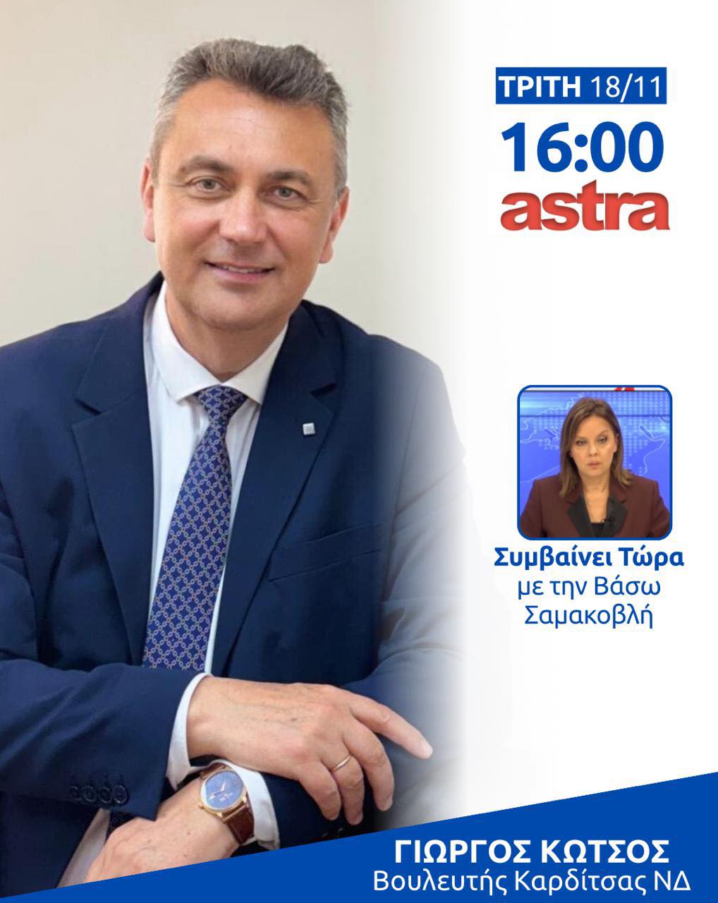 Δείτε τη συνέντευξη του Βουλευτή ΝΔ ν. Καρδίτσας Γιώργου Κωτσού στο κανάλι του ASTRA στην εκπομπή "Συμβαίνει Τώρα" με τη Βάσω Σαμακοβλή.