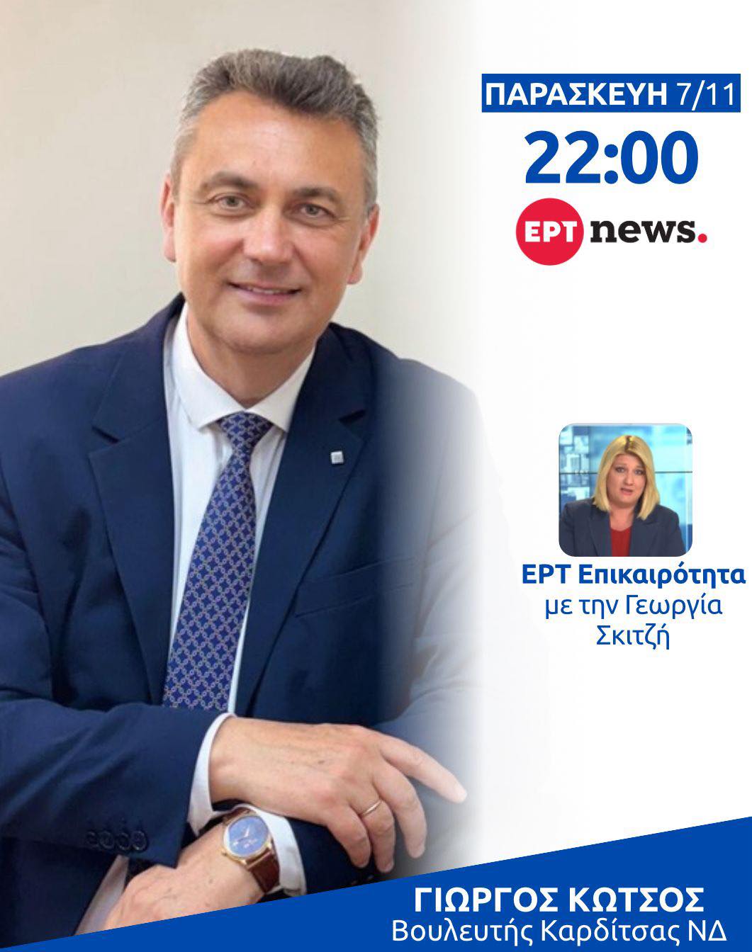 Δείτε την συνέντευξη του Βουλευτή ΝΔ ν.Καρδίτσας Γιώργου Κωτσού στην ERT NEWS στην εκπομπή "ΕΡΤ επικαιρότητα" της με τη δημοσιογράφο Γεωργία Σκιτζή.